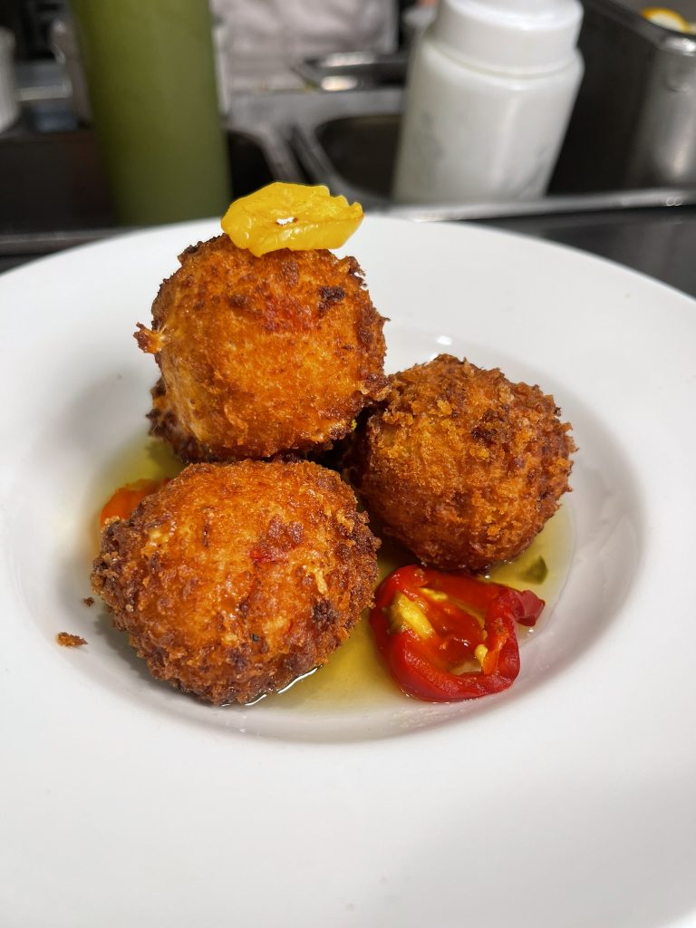 - Pimento Fritters – golden, crunchy, cheesy bites with a sweet jalapeño jelly that gives just a tiny kick.