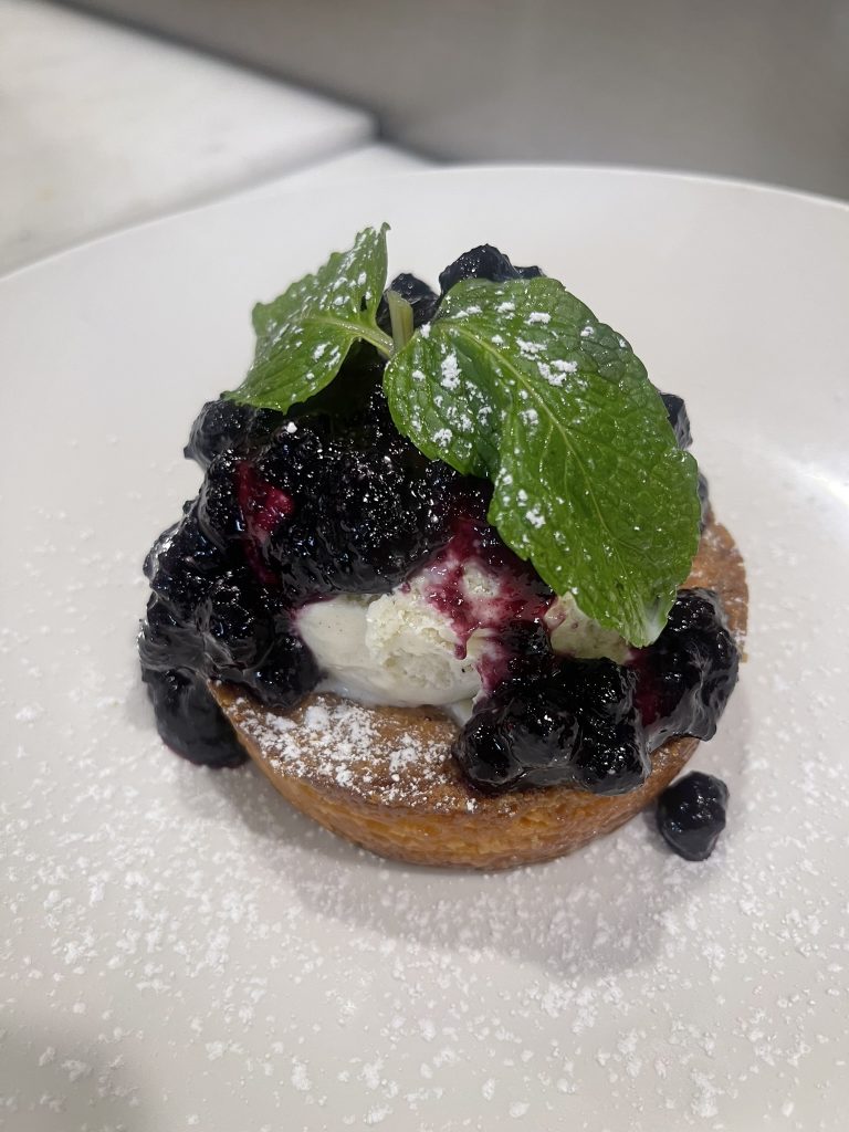 - Warm butter cake with vanilla ice cream and blueberries